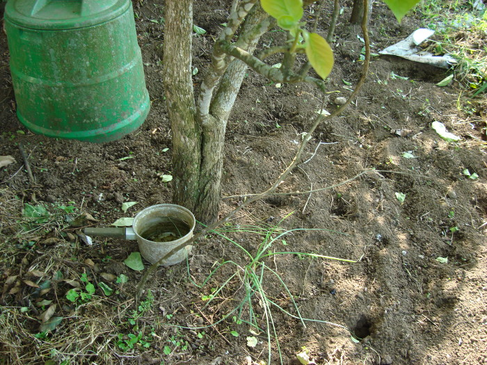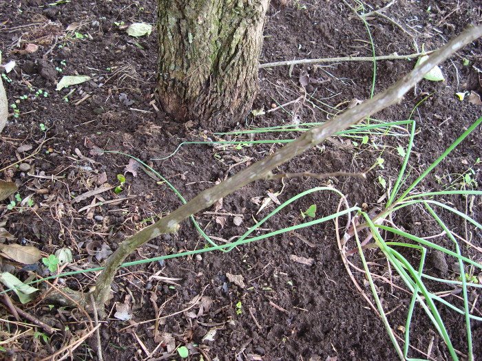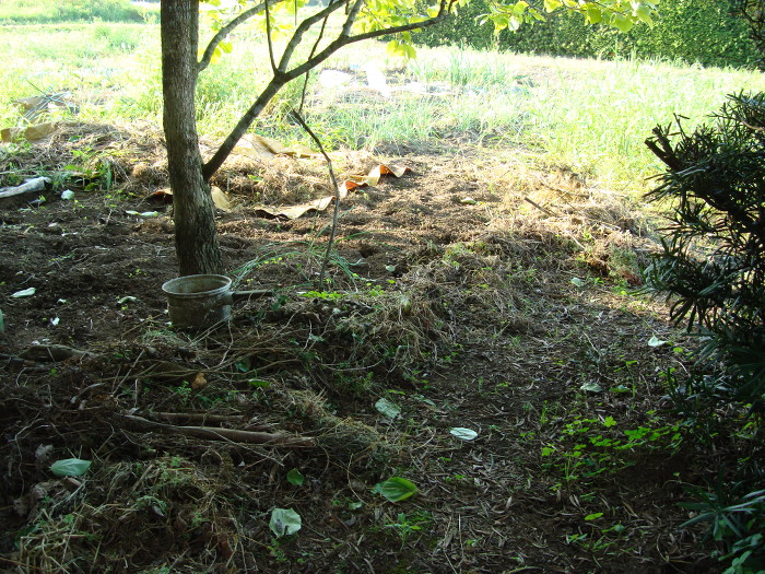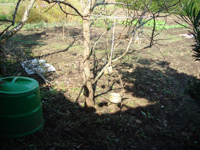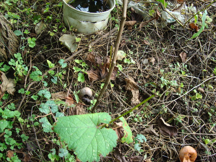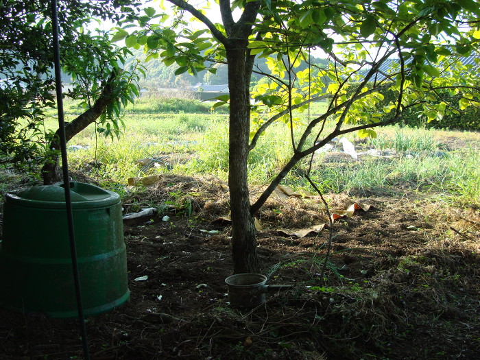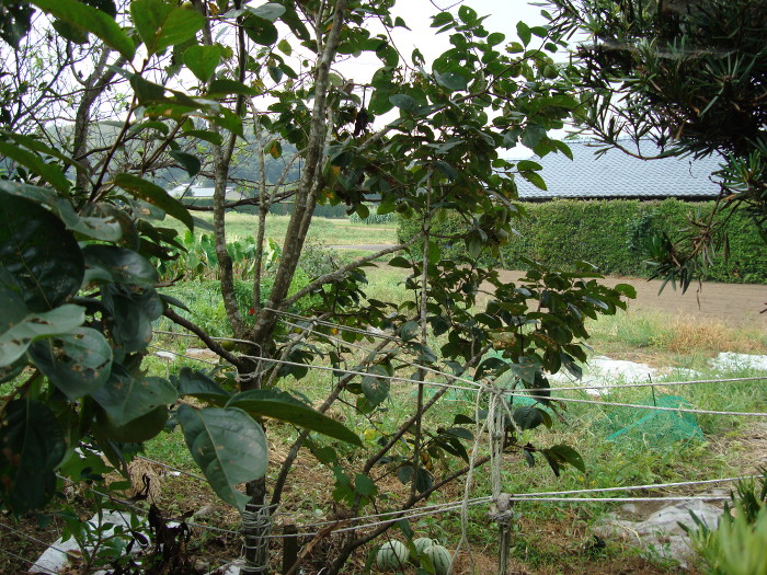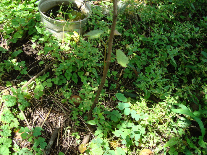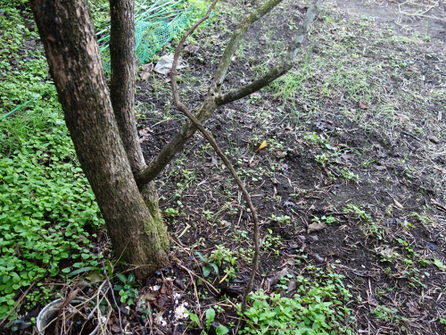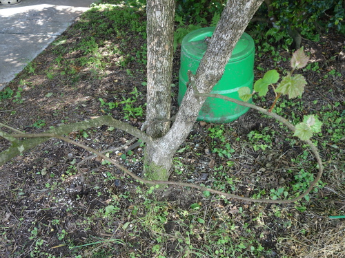 太秋の木の根元には果物の種等をよく捨てていたのですが、そこからブドウの種が発芽して、どんどん育ってきました。苗が小さいうちは草取りで抜かれてしまいがちですが、幸運なことに生き残りました。ある程度生長すると、もう抜かれることはありませんので安全です。品種が何だったのかはわかりませんが、巨峰あたりではないかと思われます。実生なのでたとえ実が生ったとしてもどんな実になるかわかりませんが、せっかく育って来たのを処分するのももったいないので、このまま様子を見ていきます。