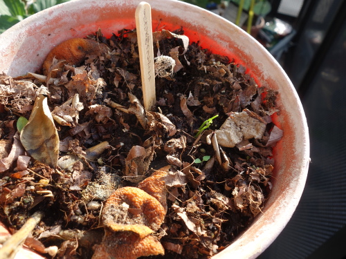 グレープフルーツの種3個を鉢に蒔きました。あとで軽く培養土被せたり、アボカドの種を覆っている皮を剥がしたものを置いたりしました。