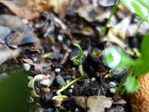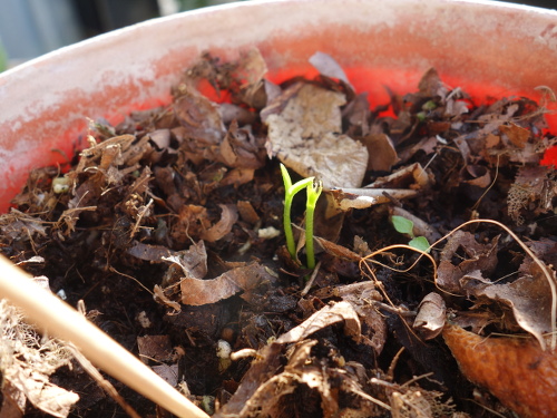 種を蒔いてから約1ヶ月半で1個から発芽していました。種1個から2本出てきています。