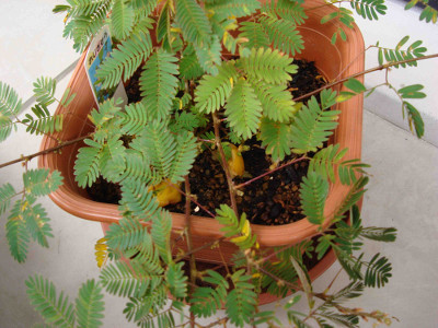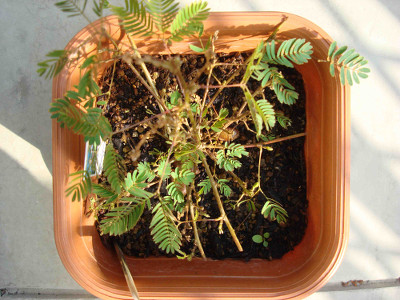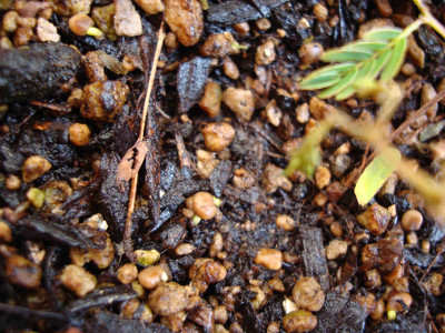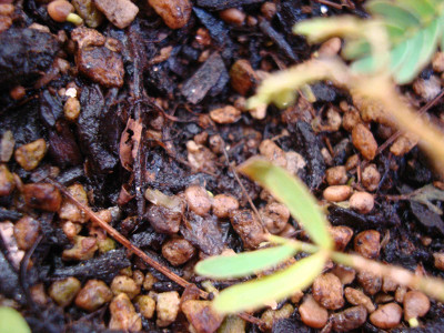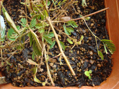 おじぎ草の根元に果実の一部を3個置いてから1ヶ月後