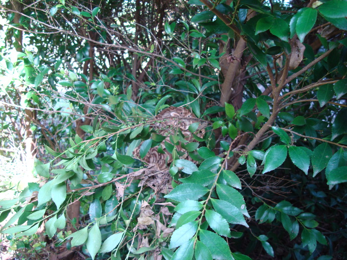何と、グアバの苗の右上1mのところの榊の枝にオオスズメバチが巣を作っていました。