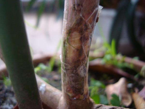 そこで、このまま放置してもだめだと判断し、ダメ元で皮を移植してみようと思いました。幹の上の方は、どのみち、このままではだめになってしまうので、幹の皮を3カ所、剪定ばさみをナイフがわりしして、削り取りました。その3枚を1枚ずつセロテープで仮止めしたのち、グルグルと23周巻きました。そのあと、紐できつく縛りました。こんな方法でうまくいくとは思えませんが、うまくいけば儲け物です。一つの経験になることは間違いありませんね。