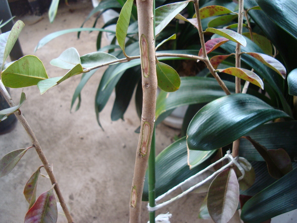 応急処置として、ひとまず、穴に殺虫剤をスプレーしてからロウソクを垂らして塞ぎました。問題は皮です。幹に沿って上と下の皮がつながっていれば生きますが、幹一周かじられて皮が寸断されると枯れるそうです。10月から2ヶ月様子を見てみましたが、やっぱりその通りになりそうです。最初は寸断された箇所は1cmほどでしたが、皮がだんだん枯れてきて、今では3cm近くに広がってしまいました。