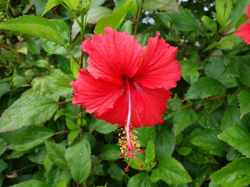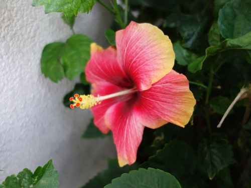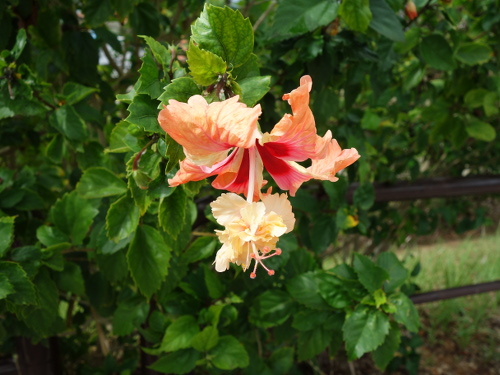熊本ではホームセンターの商品でしか見たことのないフラミンゴタイプのハイビスカスが沖縄では普通に生えていました。それを今回の沖縄旅行で見て、ちょっと感動しました。また、熊本でベランダで鉢植えしているサンセットというグラデーションのかかったお気に入りのハイビスカスと同じものが「なかむらそば」の店の前に植えてあったこと、また、その隣りの敷地に普通に地植えしてあってけっこう大きくなっていたのを見て、さすが沖縄と思いました。九州では地植えしても冬に枯れるので鉢植えしかできません。サンセットによく似たハイビスカスにミセスユミというのがありますが、「なかむらそば」に植えてあったのは葉っぱから判断してサンセットだと思います。私は両方とも鉢植えで栽培していますが、両者は花梗(かこう、花柄(かへい)ともいます)の長さにも違いがあり、サンセットの方は長く、ミセスユミの方は短いのですが、上の写真では花柄が長いので、サンセットだと思います。