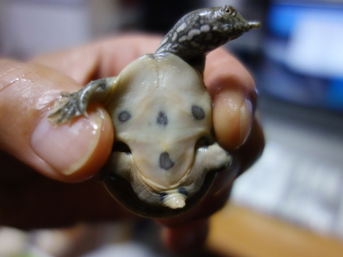 近所で保護した赤ちゃんスッポンの腹甲は赤く、成長に伴ってだんだん赤みはとれていくのですが、この台湾産の赤ちゃんスッポンの腹甲は最初から赤くありませんでした。現在の甲長は3.5cmですが、10月9日から飼育を始めた時点で甲長2.2cmで腹甲は赤くありませんでした。