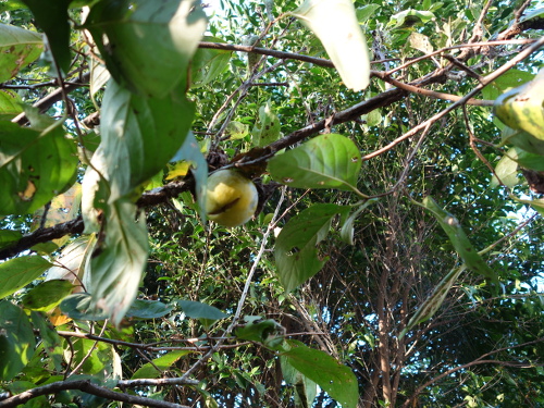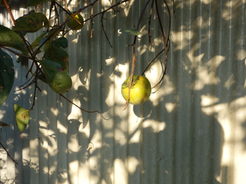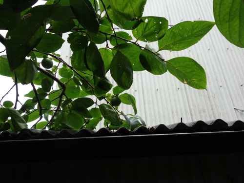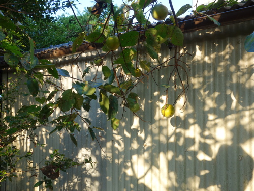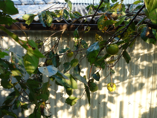 屋根の2個は見当たりません。結局、現時点では垂れた枝に5個と割れた1個の合計6個が落ちずに生っています。