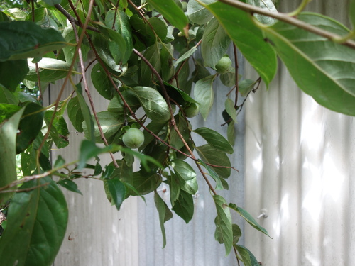 2018年9月15日現在、順調に育っている実が5個と、割れた実が1個確認できています。あと1ヶ月の間、台風も来なければ初めてまとまった個数で収穫できそうです。いさはや柿の授粉樹としては太秋または禅寺丸がよいとされています。うちでは3メートル先に禅寺丸があり、10メートル先に太秋もあるので、どちらか1本が花が咲かなくても、もう1本が授粉樹になってくれると考えると安心です。