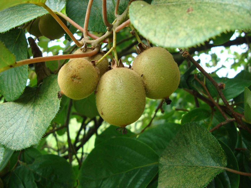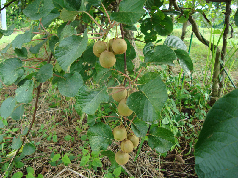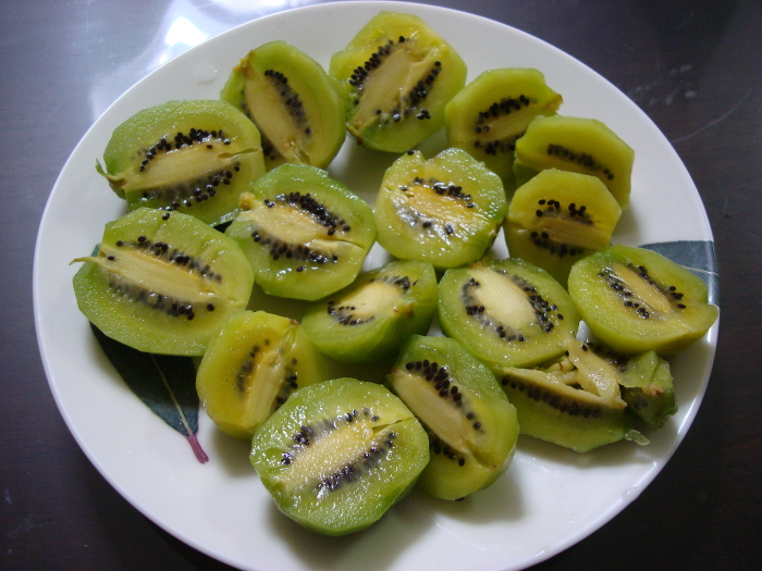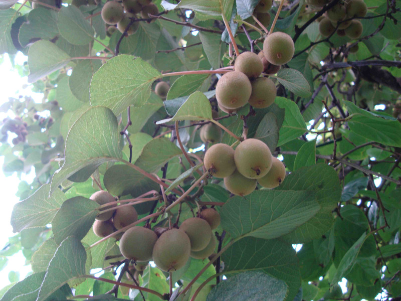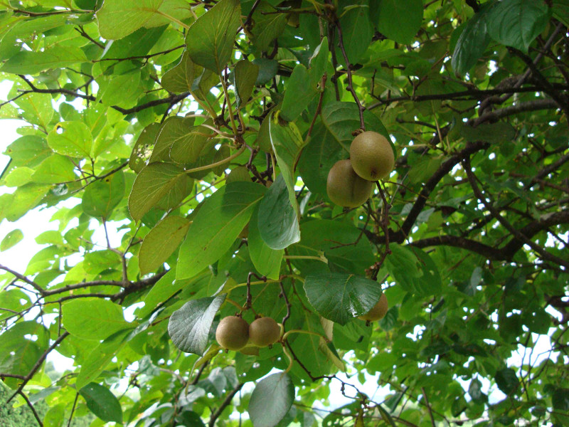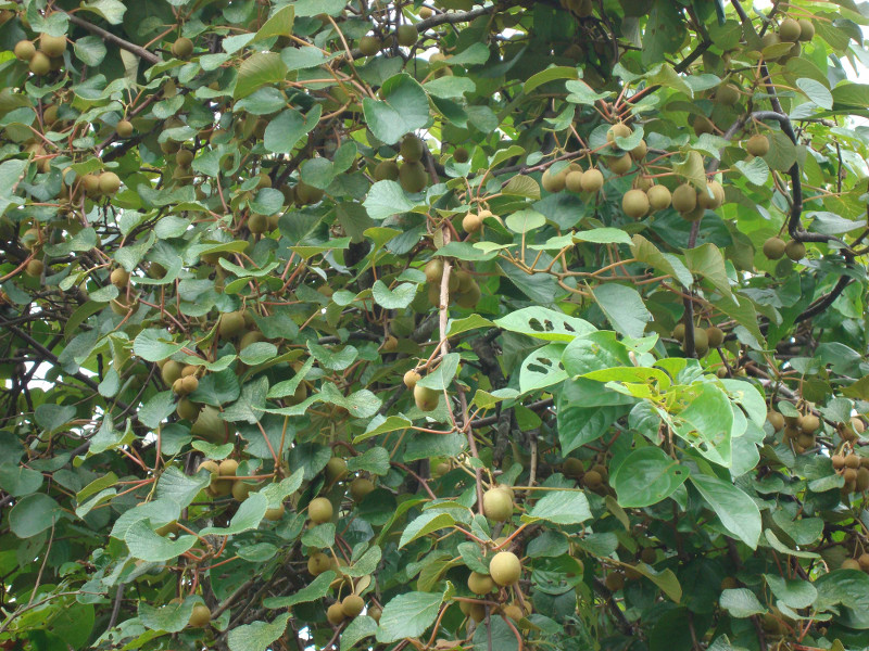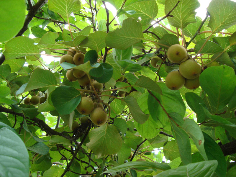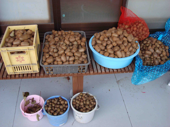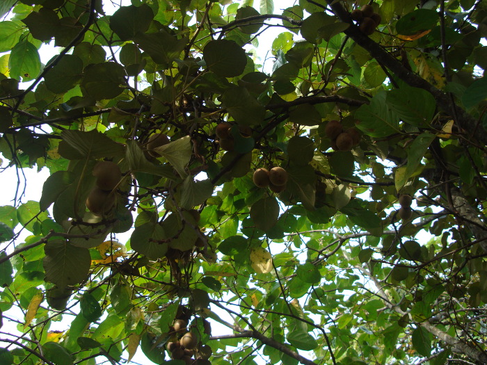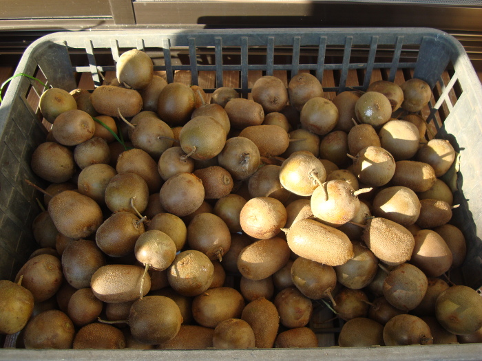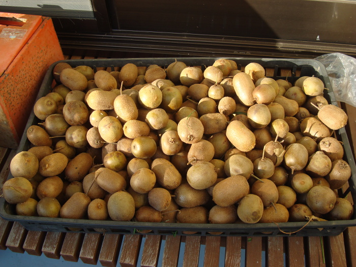 キウイゴールデンキングは隔年で鈴生りになります。生りすぎた翌年はあまり生りません。それは当然ですね。本来なら鈴生りの段階でもっと数を減らせばよいのでしょうが、きれいに生っているのが観賞用に良いのと、何となくもったいないという気持ちがあって、そのままにしています。もっとも、高い脚立を持って来ないと柿の木の上までは届かないという問題もあります。ゴールデンキングの味は香緑ほど甘くはありません。しかもうちで採れる果実は間引いていない影響で通常サイズの半分から3分の1程度です。ビジネス用ではないので、それでいいと思っています。