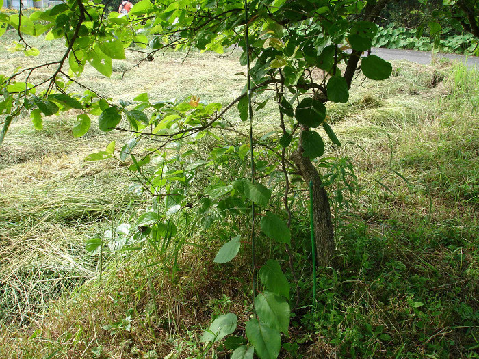 2016年6月5日(日)現在、3本目の木に実が生っているのが確認できました。昨年の台風のダメージが比較的少なかった木です。富有柿の木に絡ませているのですが、同じ場所に絡ませているゴールデンキングの木はバッサリ剪定したので今年は実は生っていません。来年に期待します。