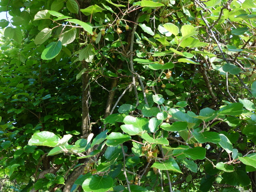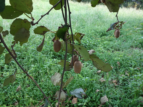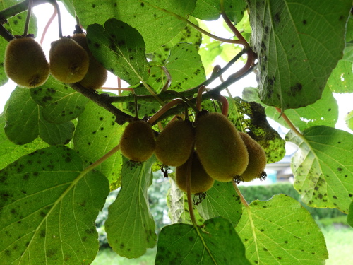 2016年9月23日現在、今年はキウイは昨年の台風の被害からの復活の年で、我慢の年ですが、この香緑No.3に10個〜20個ぐらいは生っています。アップルキウイもダメージが大きかったですが、予想外の1個が生っていました。来年2017年は香緑の木3本と、ゴールデンキングの木1本と、アッルウキウイの木1本と、ヘイワード1本の合計6本のうち、3本は復活してたくさん実を付けてくれると思っています。