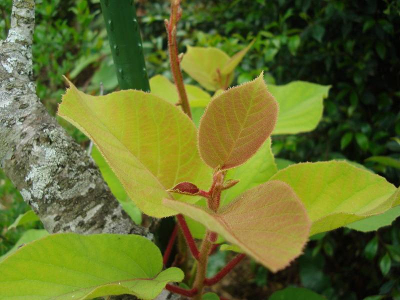 2014年4月5日(土)、白桃の木に這わせたキウイ香緑の実生に、赤い産毛のついた新芽が出てきていました。これはこれできれいです。