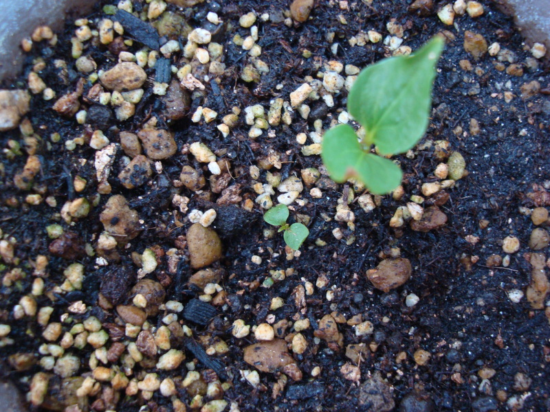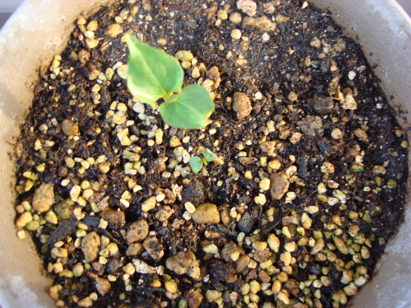 2014年4月12日(土)、空いていた鉢に土を入れて、発芽したキウイ(香緑かゴールデンキングのどちらか不明)の苗を移植しました。このキウイは家で栽培して収穫したものです。