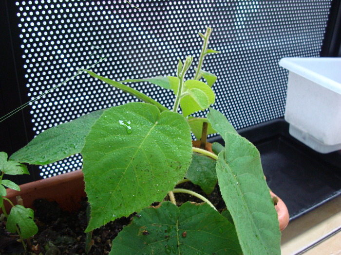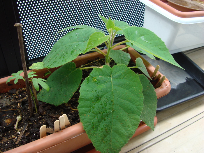2014年4月13日(日)、雨が降っています。鉢(No.1)にベランダで雨が降り、葉っぱに付いていた砂埃が洗い流されてきれいになりました。昨日より葉っぱが少し大きくなったように感じます。