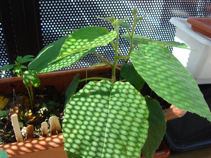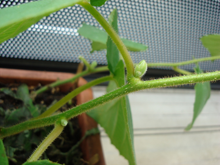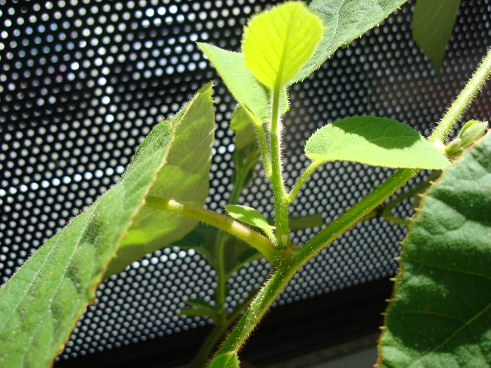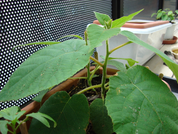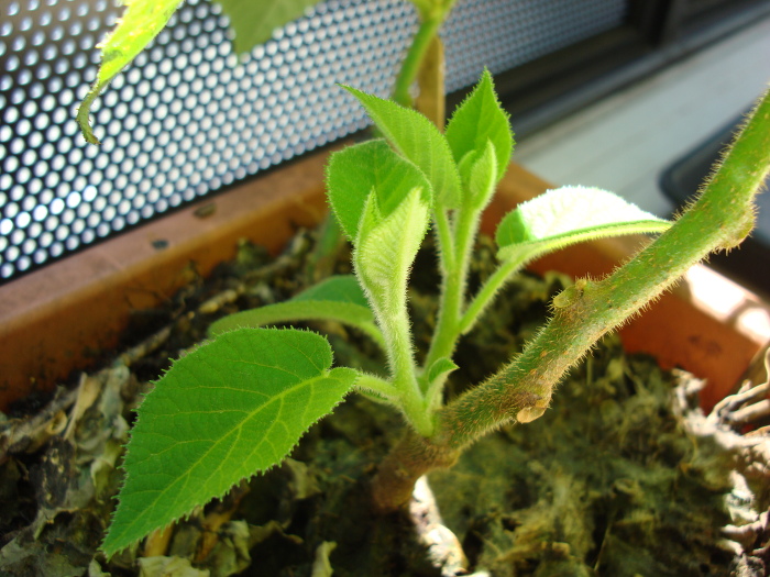 2014年8月12日(火)、分枝になる芽がだいぶ生長してきました。主鎖の先の方より、枝の方が生長が速いように思うくらいです。この先、苗が大きくなったら、根も張るわけですので、プランターでは大きさが足りなくなるのではと心配になります。その分、水もたくさん補給してやらないといけませんので。やはり、地植えを考えなければいけないかもしれません。