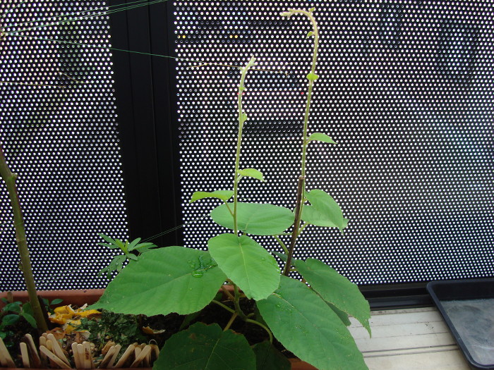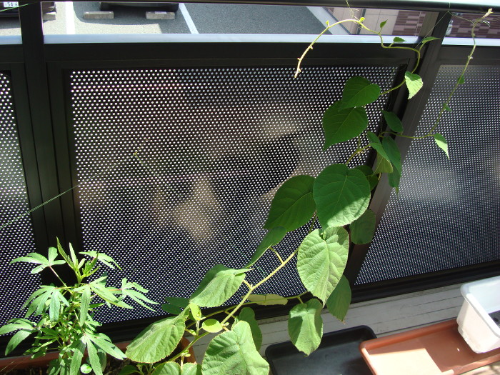 2014年7月19日(土)、だいぶ蔓が伸びてきて、不安定感があります。どこかに巻き付いて伸びていかないと、このまま直立は無理ではないかと思います。