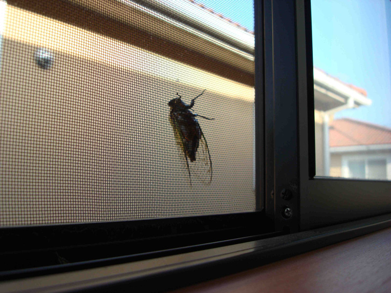 2013年夏、今年は引っ越してアパートで夏を迎えていますが、例年通り、熊蝉が喧しく鳴いています。しかも、今年は至近距離で泣かれるため、かなり喧しいです。ここに紹介するのは、ベランダの金網にくっついて鳴き始めた熊蝉と、その翌日に、別の部屋の網戸にくっついて鳴き始めた熊蝉です。