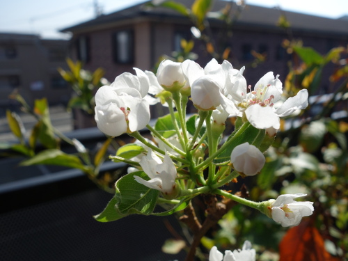 偶然ですがちょうど2020年も同じ日に花が咲いていました。2020年はラ・フランスの実を4個収穫できたので、今年も結実することを期待しています。一方、隣で栽培しているル・レクチェは今年2021年はラ・フランスから少し遅れて咲きました。授粉樹としてラ・フランスとル・レクチェを1本ずつ栽培しているのですが2本同時には花が咲かず、ル・レクチェの方が少し遅れて咲きます。昨年2020年はル・レクチェの花は咲きませんでしたが、ラ・フランスは咲いて実がなりました。よってうちのベランダの環境では必ずしも授粉樹は要らない可能性もあります。