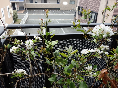 2018年3月に買ってきてベランダで栽培している鉢植えラ・フランスがちょうど栽培3年になりました。2021年も花が咲きました。以下にその写真を示しています。
