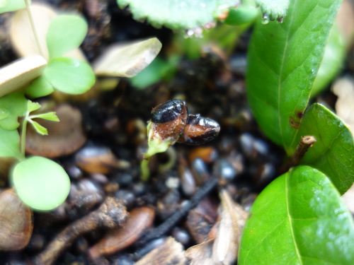 霜に打たれた未収穫のムベは、とても甘くなります。11月の楽しみです。その前に鳥のエサになる可能性もありますが・・・。芽が出てきたらまた観察を続けます。