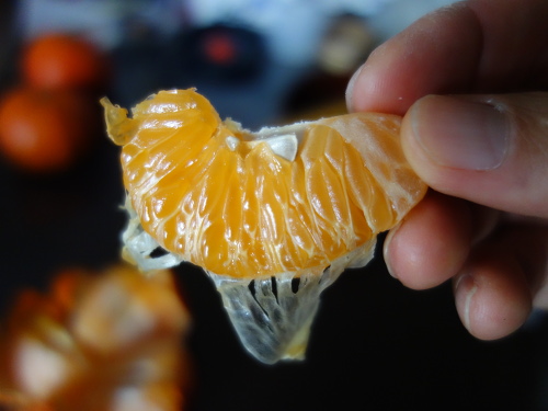 表皮と比べると中身はあまり橙色にはなっていません。じょうのう膜は薄いです。私は温州みかんのじょうのう膜はそのまま食べますが、ノバ・オレンジのじょうのう膜も丸ごと食べても全く気になりません。むしろ温州みかんよりも食べやすかったです。