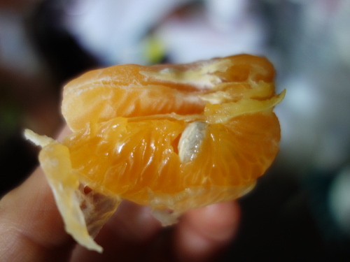 4日後の大きい方の1本。もう1本は枯れてきました。購入してから10日後に残っていた3個のノバ・オレンジの果実のうち1個を1月12日にを食べてみたところ、タネが9個入っていました。このノバ・オレンジは甘さ控えめのポンカンという感じでした。ポンカンに似ているのでノビレチンがたくさん入っているのではないかかと期待してしまいます。ノバ・オレンジは温州みかんと比べると表皮が若干硬く、温州みかんのように簡単に剥ける感じではなかったですが、だからといってネーブルのように剥きにくい感じでもありませんでした。温州みかんと比べると種がたくさん入っているといえます。その種を鉢の中に入れた「花と野菜のかる〜い培養土」に蒔きました。発芽したら実生苗を1〜2本育ててみようと思います。