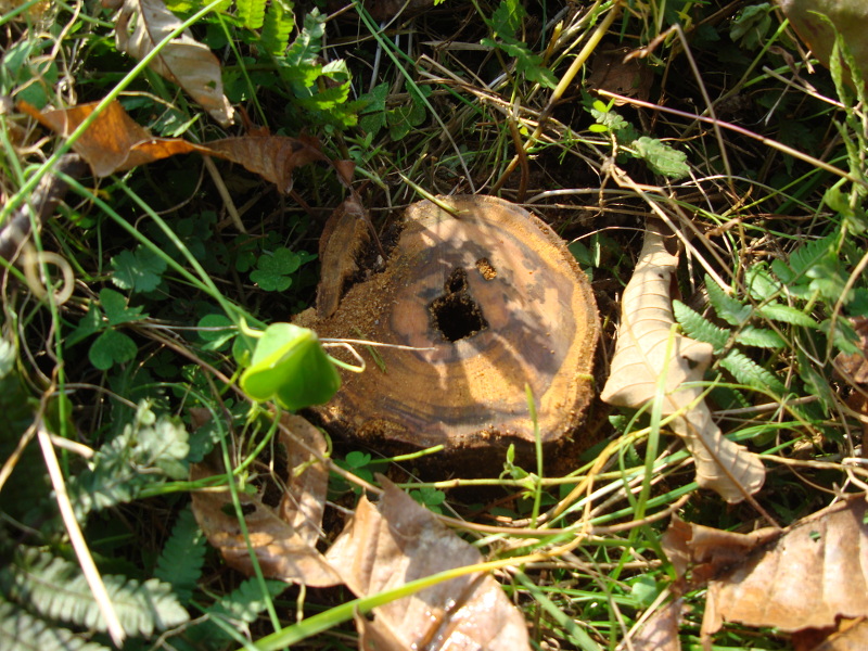 幹を根元から切りました。切り株に空洞が見えます。これが枯れた原因です。