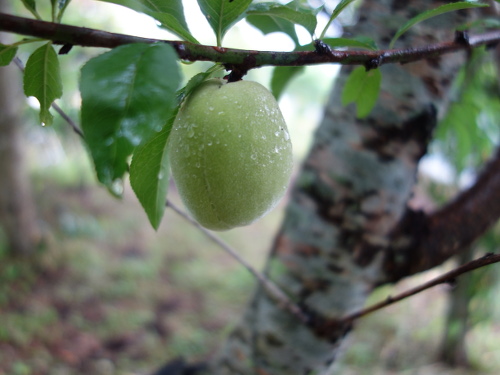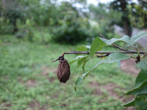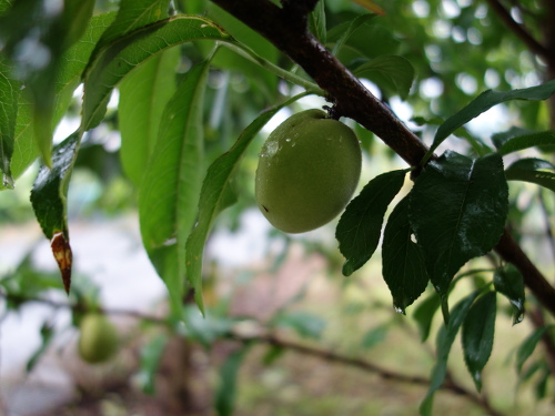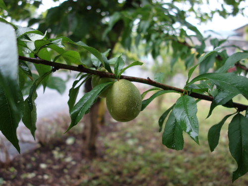 2002年頃に白川の河川敷であった春の植木市で買って来た川中島白桃の苗木が、2004年、2005年にはきれいな実をつけました。その後、木がおおきくなるにつれ、実が収穫できなくなってきました。そこで、2013年に幹をバッサリ切りました。そのあと、枝が出て来て2015年には実が数個生りました。