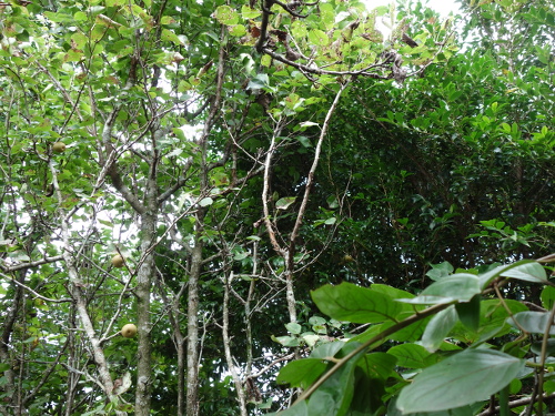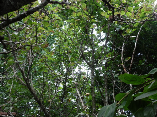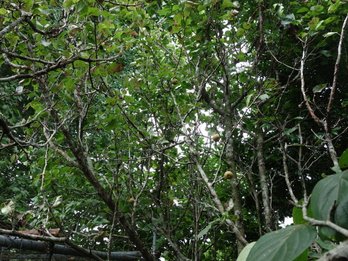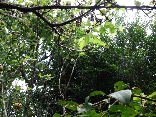 2004年に植えた市販の接木苗が2018年現在、14年になりました。かなり生長しています。2013年にはかなりたくさん生ったことがありましたが、実が小さかったし、けっこう落ちてしまいました。2018年は数はそれほど多くなく10個前後ですが、大きさは昨年までの実よりは大きいです。上の方の枝を切るなどして樹形を整えれば、もう少し改善されるかもしれませんが、ニワトリ小屋の日陰をつくる役割や、台風の時の防風林の役割も兼ねているので、果実の収穫ファーストではありません。今後はバランスを考えていきます。榊の木は少し切る必要がありそうです。