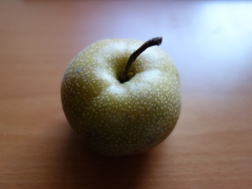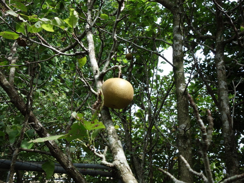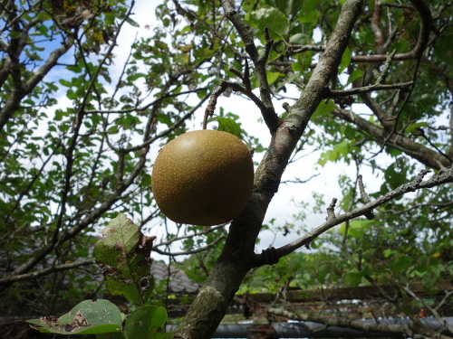 収穫した1個。市販の大きな新高梨よりかなり小さいです。でも、この木では今のところこれくらいが限界です。