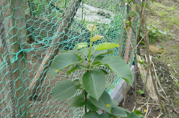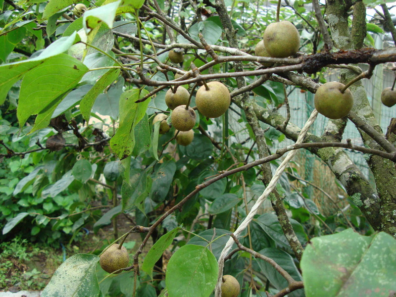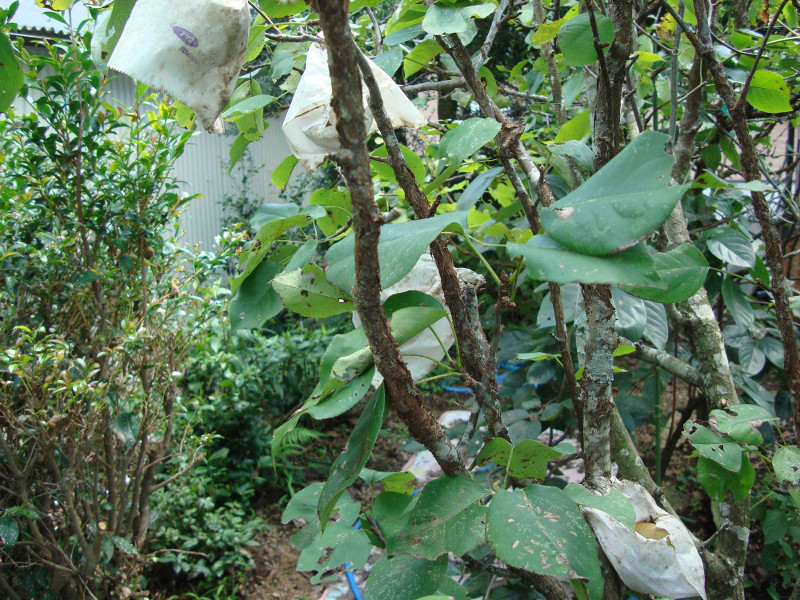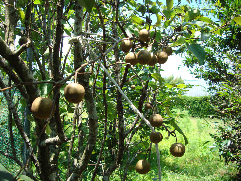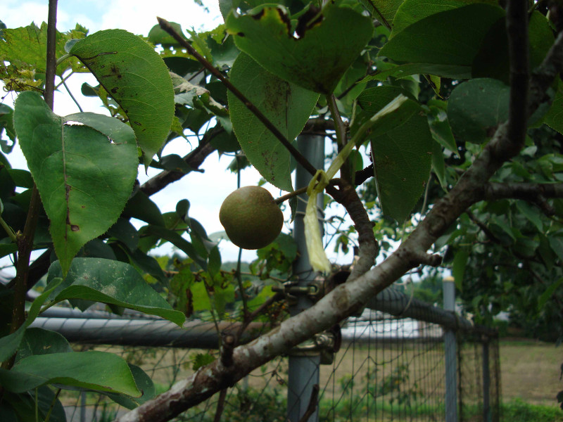 2004年に二十世紀梨と同時に苗木を植えましたので、2013年でもう9年になります。今年は袋がけをしたため、現在、新高梨の果実4個がテニスボール大に育ちました。10月中旬〜11月中旬が収穫期ですので、このまま落果せずに育ってほしいものです。二十世紀梨同様、無事収穫できれば今年初めてです。