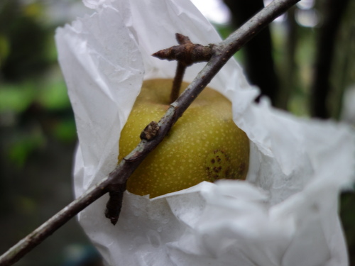 2015年の新高梨は2個だけ袋掛けできました。小さい方の1個。