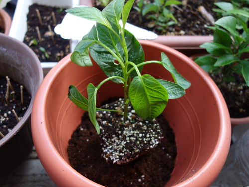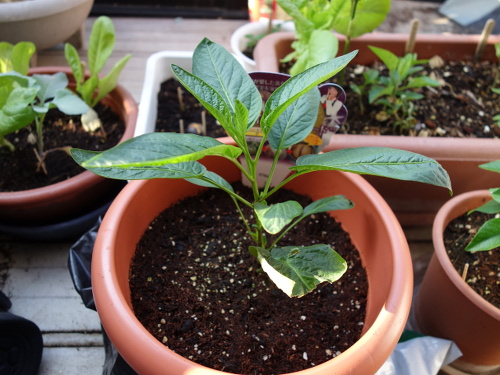 ペピーノの苗を鉢に入れてみました。高さを合わせるために、市販の「花と野菜のかる〜い培養土」を敷きました。