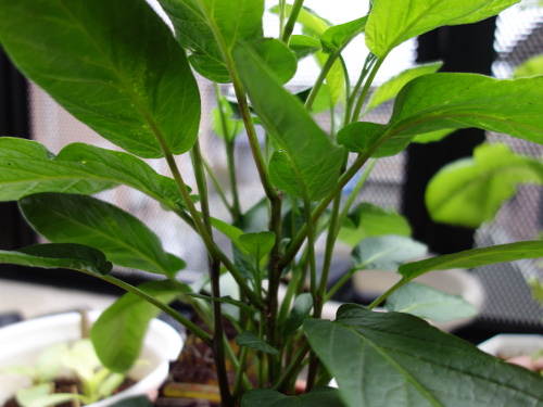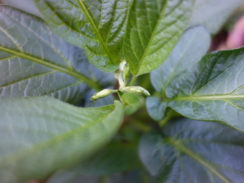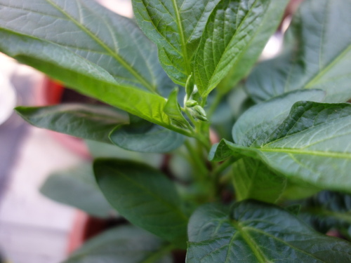 枝(脇芽)が生長しています。脇芽は摘んでしまって1本で育てた方が容易であると説明書きには書いてあります。しかし、ペピーノの栽培は初めてで、興味があったのでそのまま摘まずにいきました。これから出てくる分は考えようと思います。