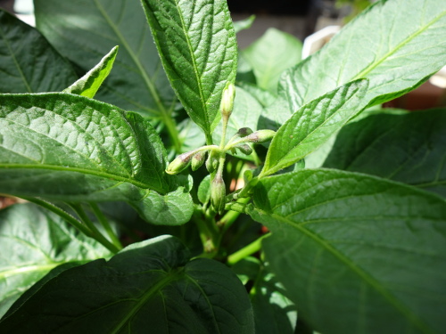 ペピーノは人工授粉が必要となっています。綿棒で花の黄色い部分を触ってみましたが、黄色い粉はつきませんでした。しかし、一応、雌しべに接触させてみました。晴れた日の午前中がよいようです。確かに、パッションフルーツの場合、天気のよくない日の人工授粉はあまりうまくいきません。