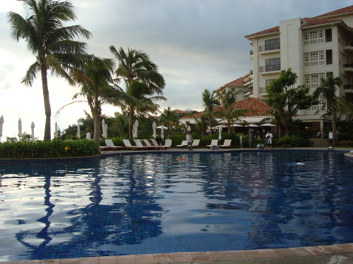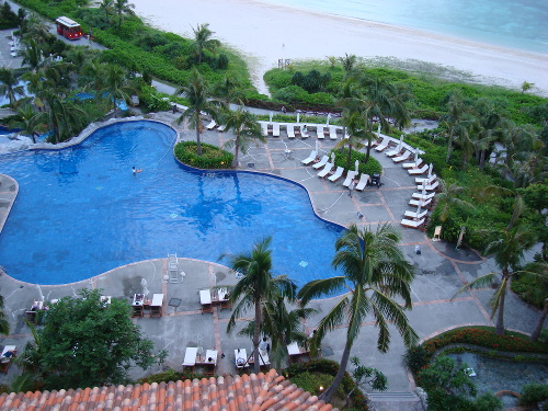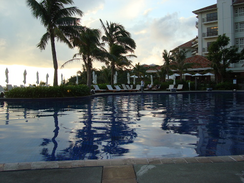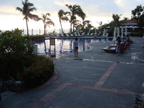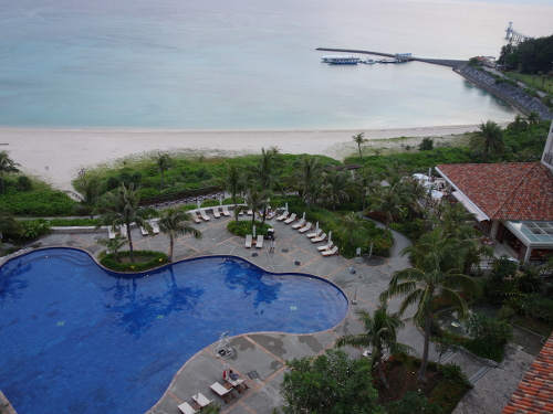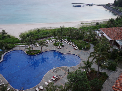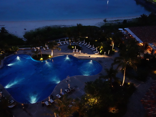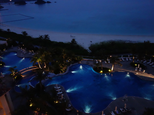 18:14撮影。セントラルタワー9Fのゲストルームのベランダでから見たプール。