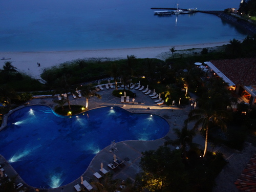 ザ・ブセナテラスの好きなものを3つ挙げなさいといわれれば、私が間違いなく挙げる特色あるイベントが、このプールサイドでのサックス生演奏です。夕方になるとプールサイドにスピーカーが準備されます。だいたい18時過ぎに男の人が現れてカラオケのような機器の設定を始めます。そして、カラオケの演奏と一緒にサックスの演奏が始まります。日没前のライトアップされていない時間帯から日没後のライトアップされた時間帯まで続きます。私たちは宿泊1日目は夕食にしまぶた屋に出掛けるので終わりまで聴いたことはありませんが、宿泊2日目は最後まで聴くことができます。だいたい1時間ぐらいのようです。つまり、日没時間がわかっているので、その前後30分、トータルで約60分ということのようです。しかし、サンセット前後30分といっても、実際は開始時刻はまちまちな感じがしていますが、どうなんでしょう。