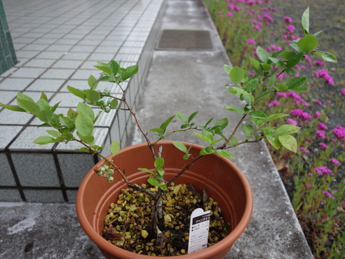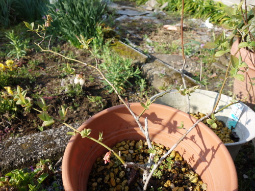 シャープブルーは2012年に買って来た時は実がたくさん生っていましたが、花は見たことがありません。今回、鉢植えにして復活を期待しましたが、何とかうまくいったようです。2017年4月2日現在、花が咲いています。このまま順調にいけば実が生ってくれるでしょう。鉢植えに戻して正解でした。来年はもっと大きくなってくれるでしょう。一方、同時に鉢植えに戻したビッグオニールは、復活は厳しいかもしれません。
