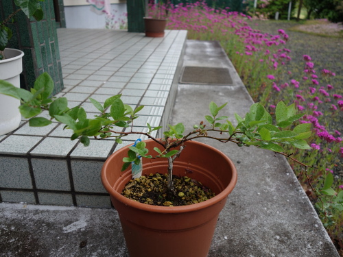 反対側から見たら横一直線に見えます。見る角度によって樹形がかなり変わります。ブルーベリーの盆栽も面白いかもしれません。