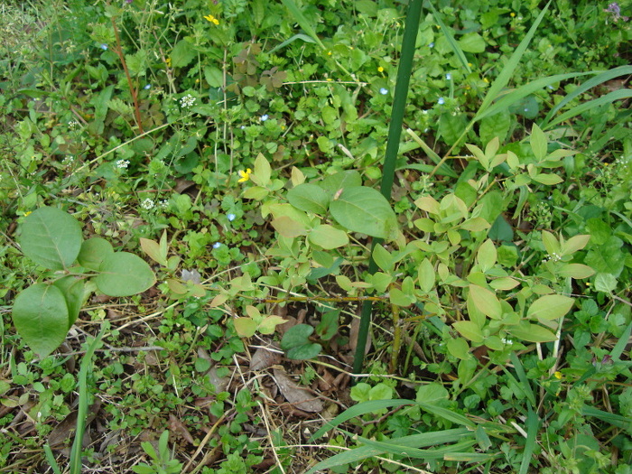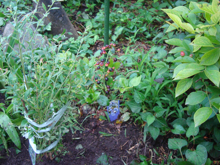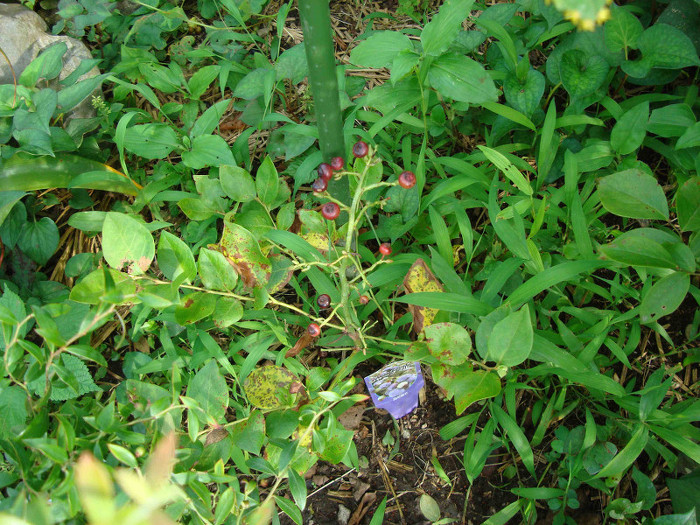 2012年7月1日 シャープブルー(中央)の隣に植えた新しいビルベリーの苗(左)。