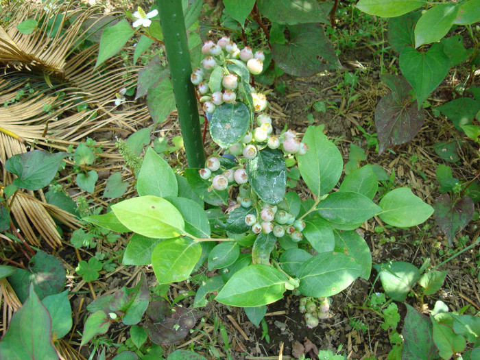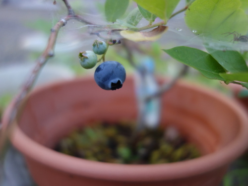 2017年5月5日現在、実が生っていました。シャープブルーは畑から鉢植えに戻したら復活しました。やはり畑の土が合わなかったようです。ビッグオニールも鉢植えで復活しました。