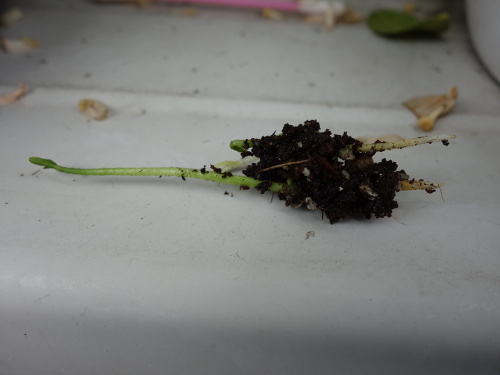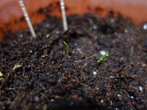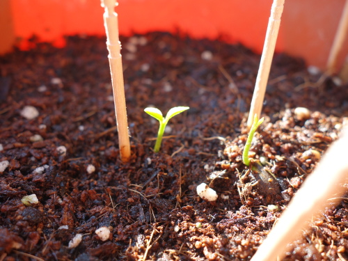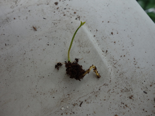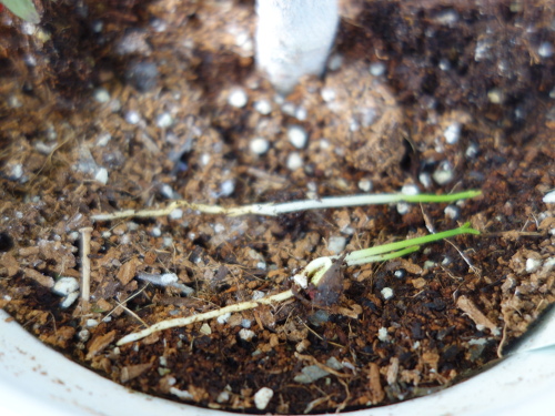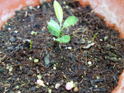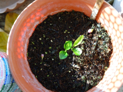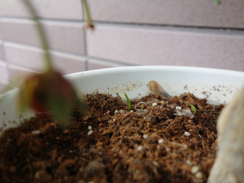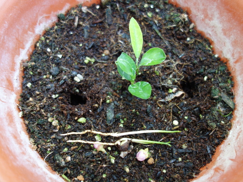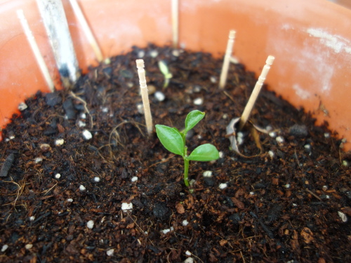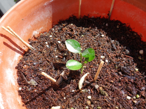 シークヮーサーの接木苗の根元に蒔いた種が発芽していました。種2個分です。