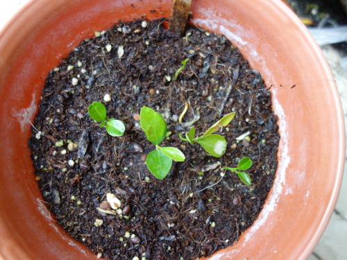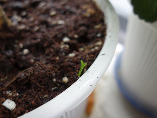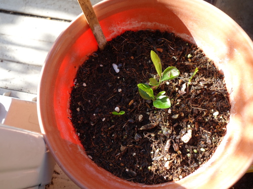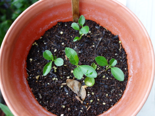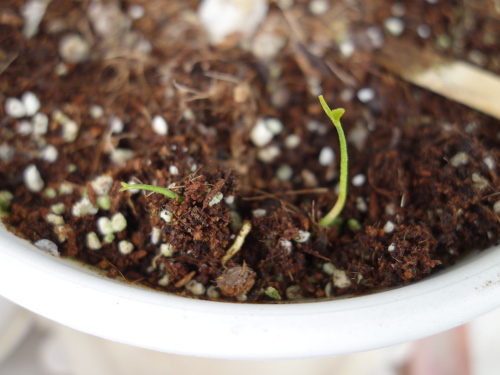 シークヮーサーの接木苗の根元に蒔いた種がさらに発芽していました。