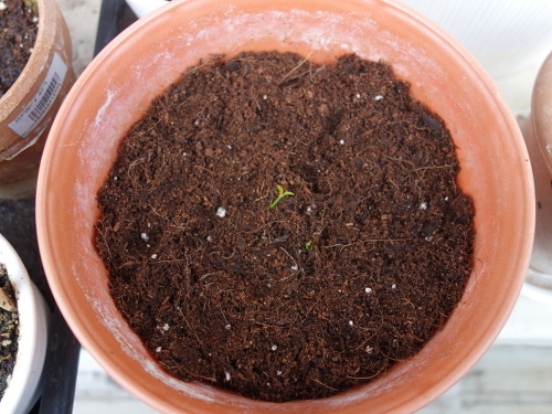 写真の中央から少し上にある苗が、今回移植した実生苗。