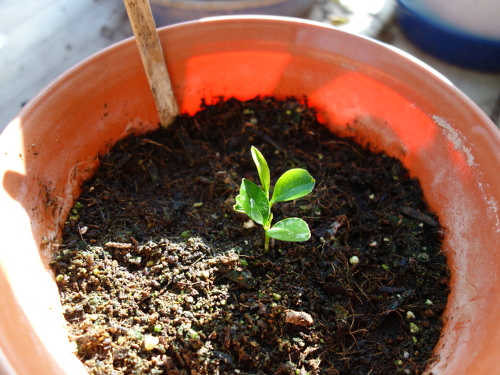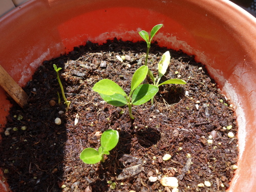 2018年5月現在、実生苗が7本あります。そのうちの3本は多胚性の種から発芽したためか、小さいのであまり成長は期待できないかもしれません。でも、4本はしっかりした苗になっています。これらを今後どうするのか決めていませんが、実生は一般に接木苗より実がなるまでの年月がかなり長いといわれています。樹勢が強いから、木の成長の方に養分が使われて、実がなるほうにはなかなか使われないからといわれているようです。その代表的な例が柚子です。とりあえず、しばらくはこのまま鉢で寄せ植えの形で育てていき、様子を見ようと思います。