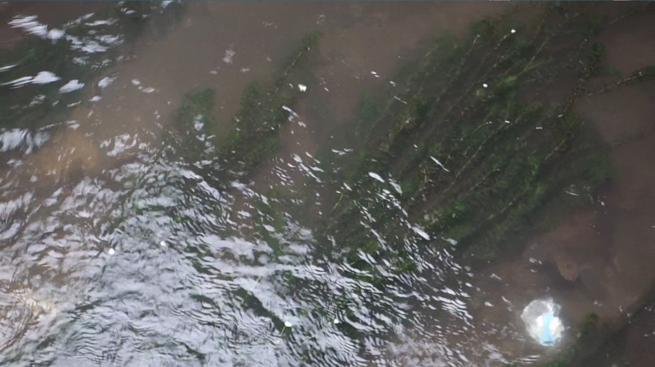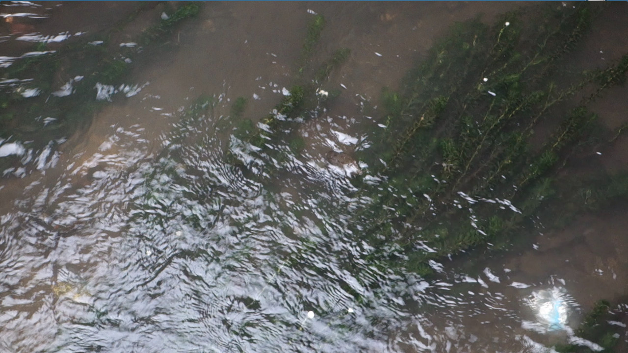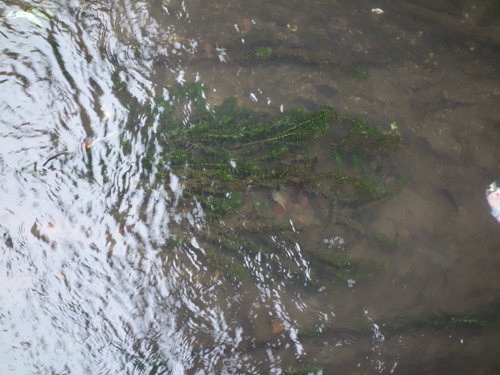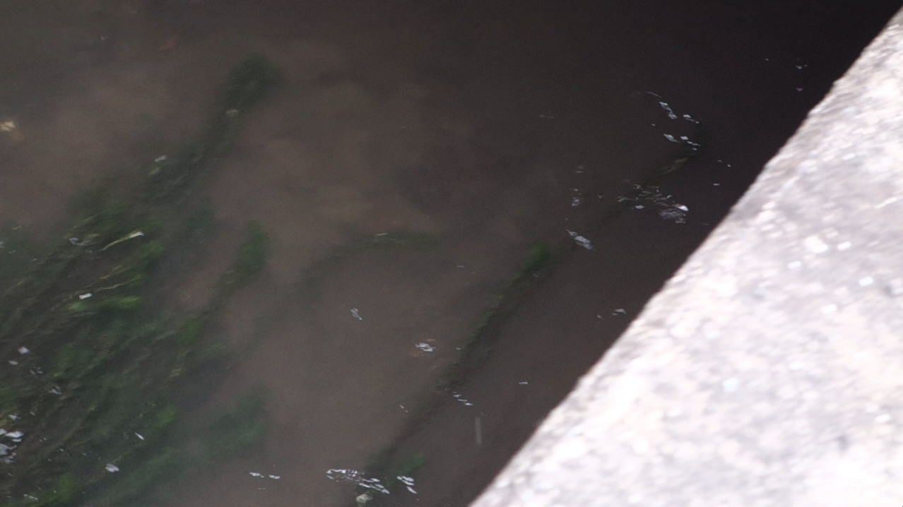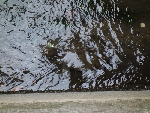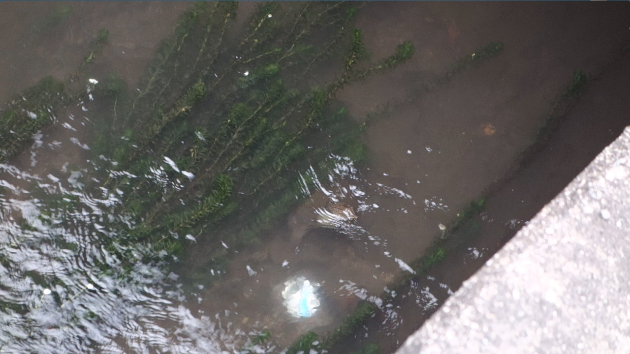 橋の下から出てきて、水草の下に隠れるところです。↓