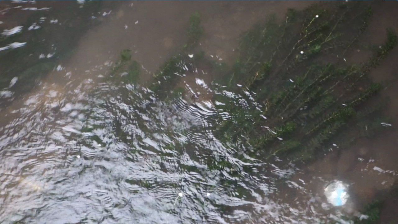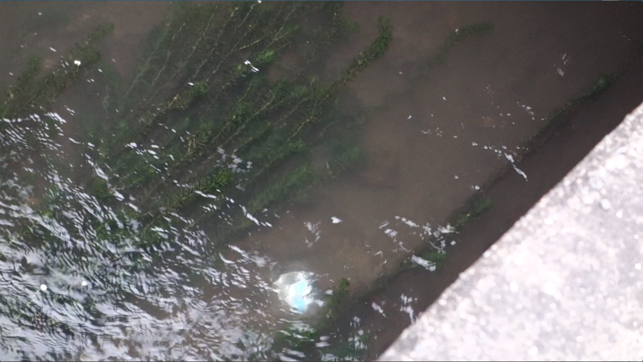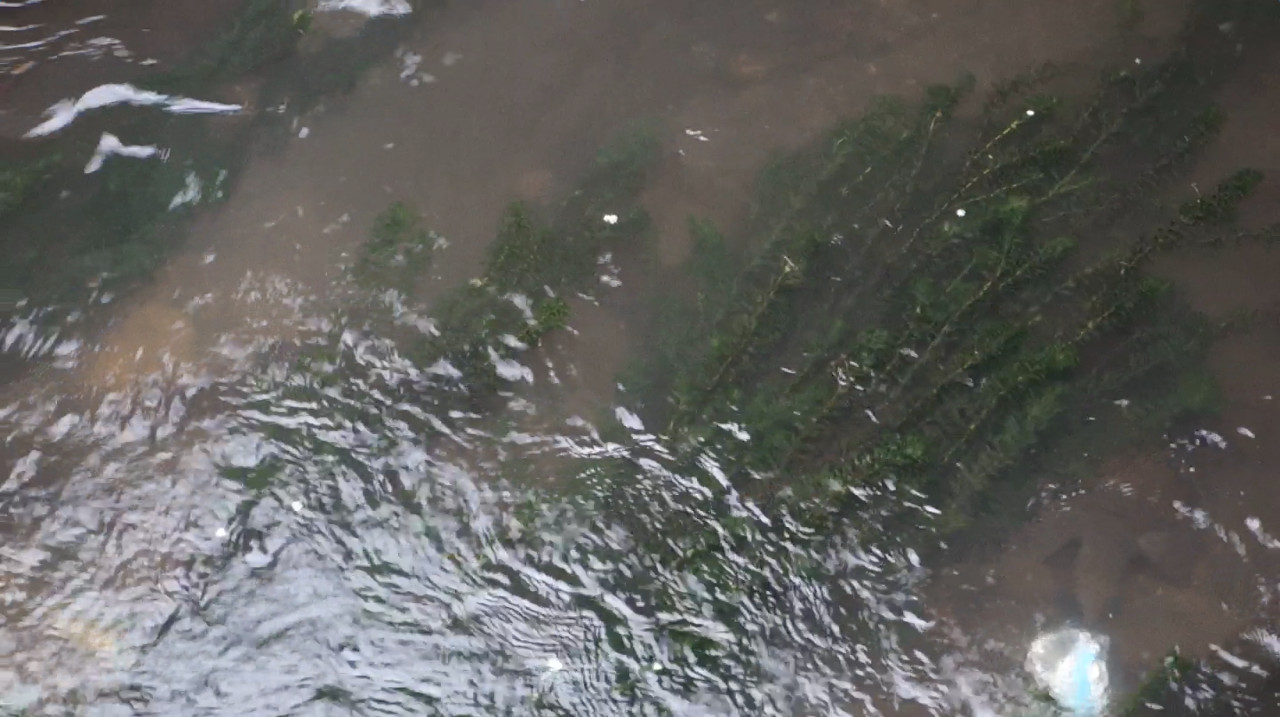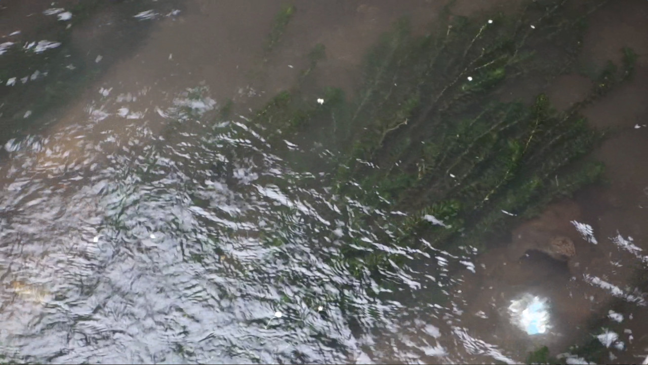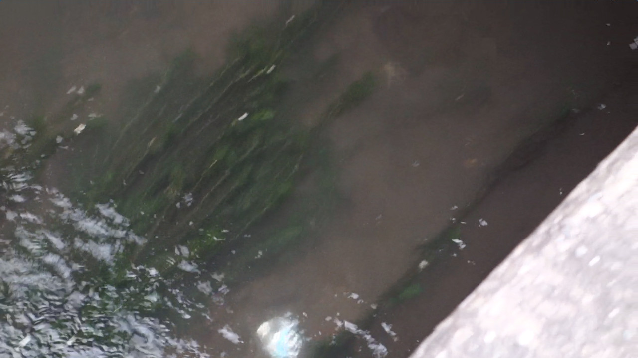 橋の下から出てきて、水草の下に隠れるところです。↓