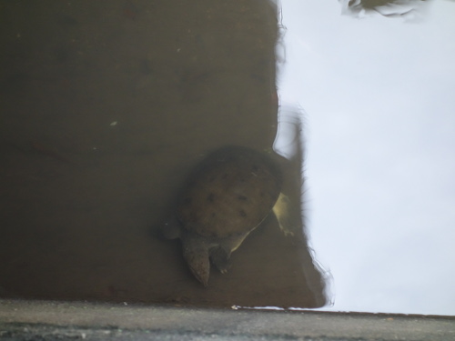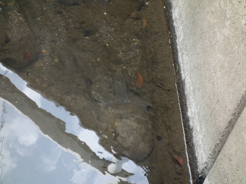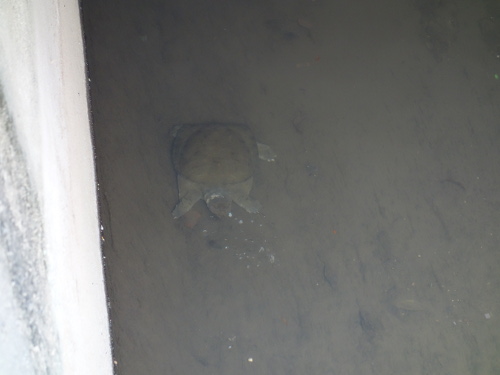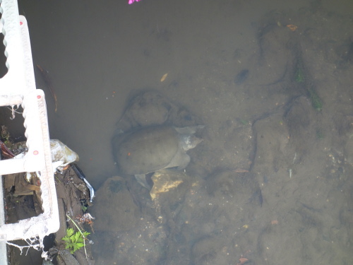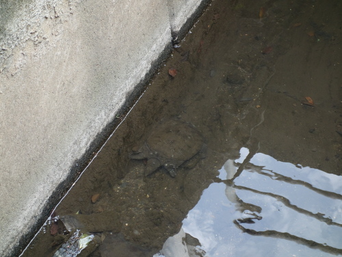 寛いでいるスッポン。このあと気づいてそそくさと橋の下(写真左の方向)に逃げ込みました。