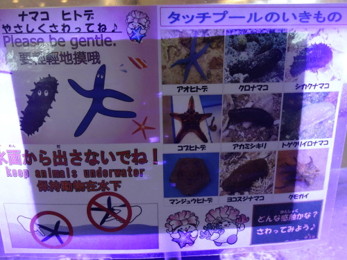 タッチプールの中の生き物一覧です。シカクナマコは写真では小さいですが、実物は大根より大きかったです。岩かと思いました。(2017年10月16日16:56撮影)