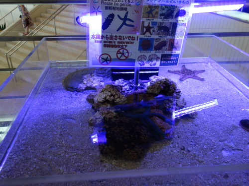 2017年10月16日にANA万座ビーチホテルの2階ロビーの近くに紫色にライトアップされた水槽が設置されていました。中にはヒトデやナマコなどが飼ってありました。触ってもいいのですが、水槽から出さないことが条件です。かなり大きいナマコとか、ちょっとグロテスクなのもいて、なかなか勇気がいるかも。こういうのが好きな人は時間を忘れてゆっくり観察できるかもしれません。当然ながら苦手な人は触るのはちょっと無理ですね。