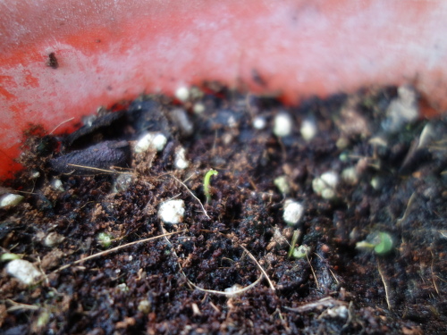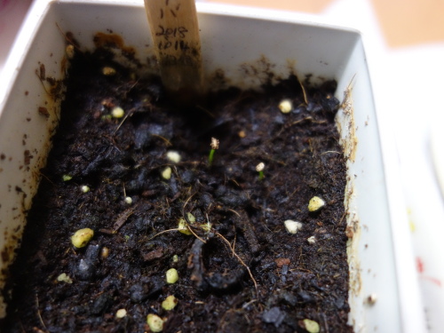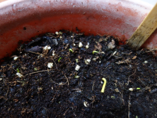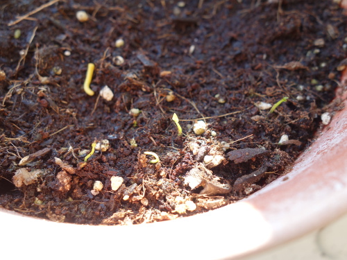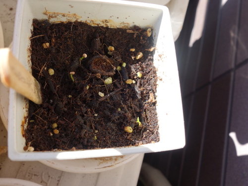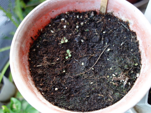 種を蒔いてから51日経過しました。2つの鉢で発芽が見られます。この写真は大きい方の鉢です。
